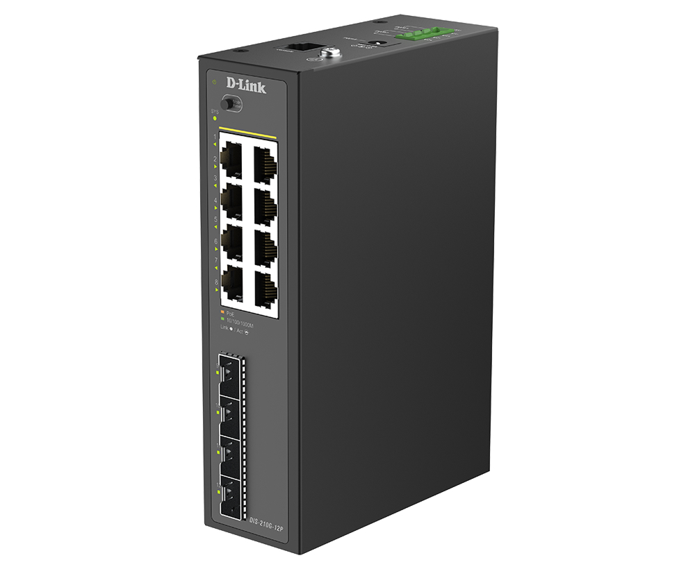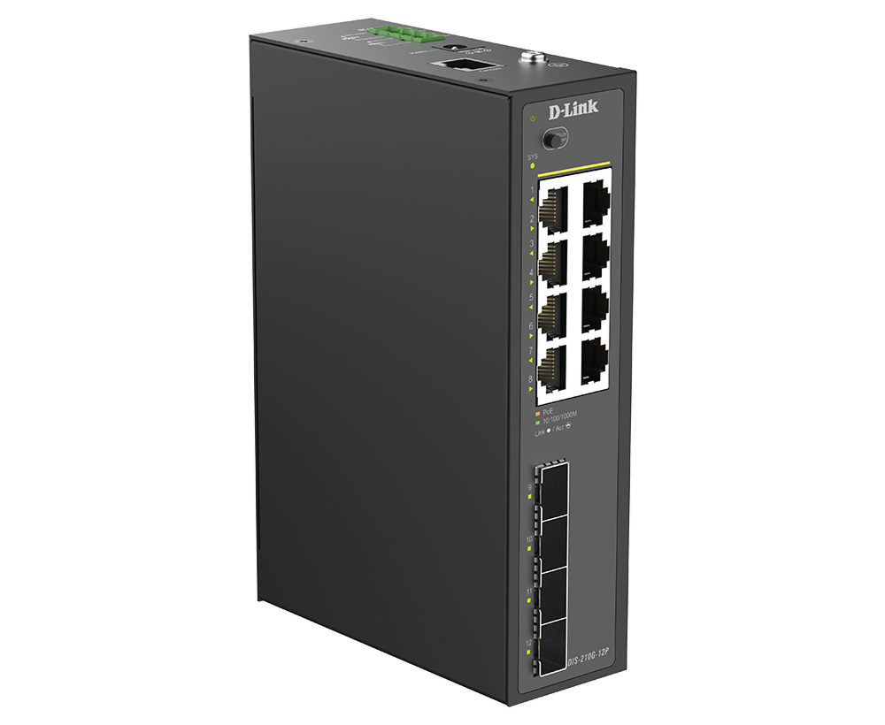Промышленный управляемый L2 коммутатор DIS-210G-12P, оснащенный 8 портами 10/100/1000Base-T с поддержкой PoE, а также 4 портами 1000Base-X SFP, которые используются для организации подключения к высокоскоростной магистрали, предназначен для применения в сетях промышленных предприятий. DIS-210G-12P поддерживает расширенные функции управления и безопасности. Функции управления включают SNMP, управление на основе Web-интерфейса и интерфейс командной строки (CLI).