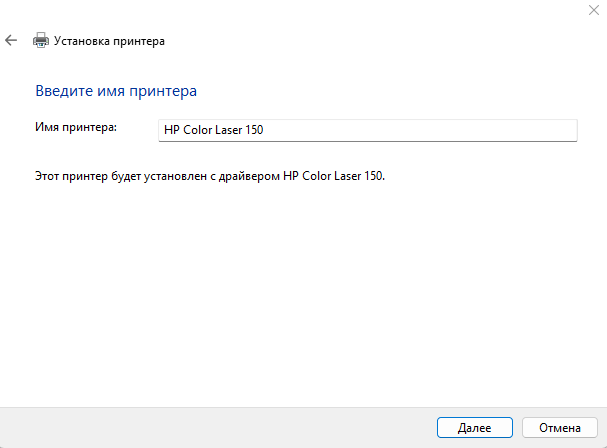 - В поле Имя принтера укажите имя принтера (произвольное) и нажмите Далее.