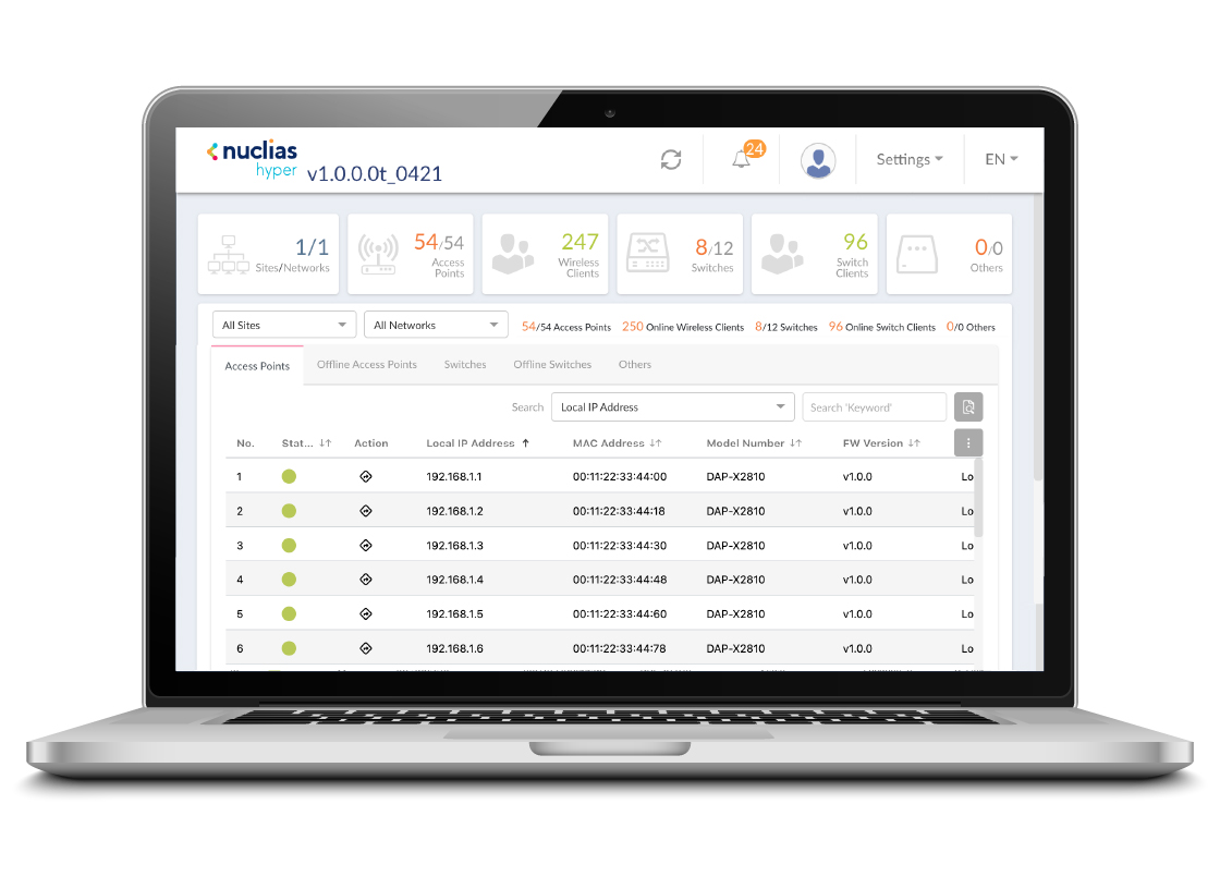 Nuclias Hyper включает 2 платформы – Nuclias Connect и NMS (SNMP Managed System). Платформа Nuclias Connect обеспечивает управление / мониторинг точек доступа и беспроводных клиентов, коммутаторов и проводных клиентов. Платформа NMS предоставляет возможность анализа и управления устройствами, поддерживающими протокол SNMP. Программный контроллер Nuclias Hyper позволяет администраторам с единой платформы эффективно управлять обновлениями ПО на нескольких устройствах. Данная функция устраняет необходимость в обновлении вручную на каждом устройстве. Администраторы могут выполнять обновления в удобное для них время, сводя к минимуму время простоя сети, кроме того, на всех устройствах устанавливаются последние обновления безопасности, что улучшает производительность.