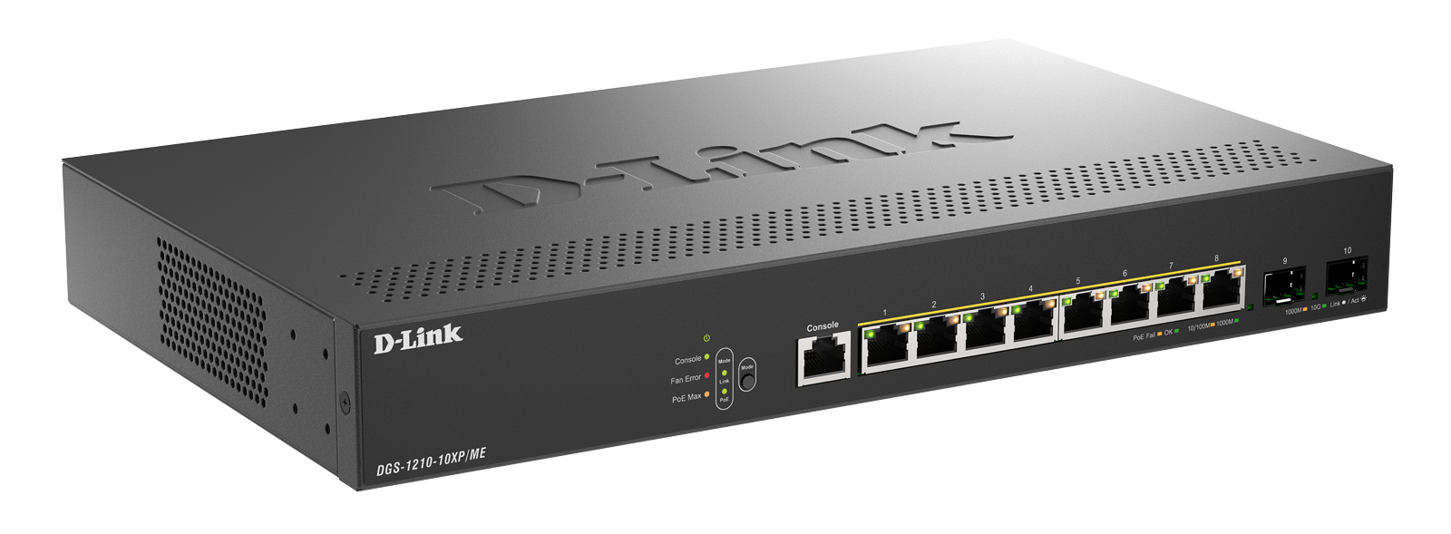 The DGS-1210-10XP/ME Metro Ethernet Switch is designed for Metro Ethernet applications. It features 8 x GE PoE ports and 2 x 10G SFP+ ports forincreased network bandwidth. Surge