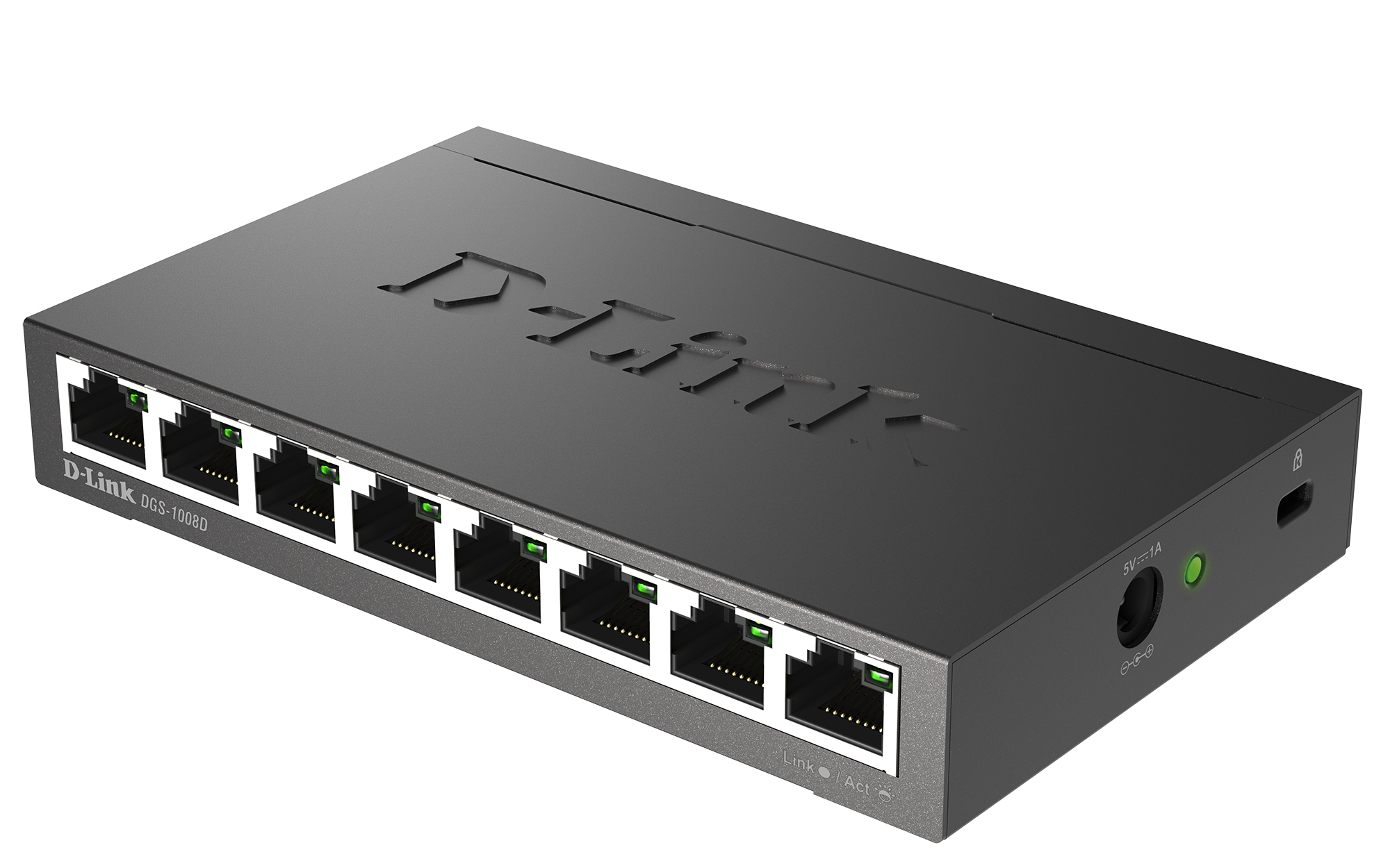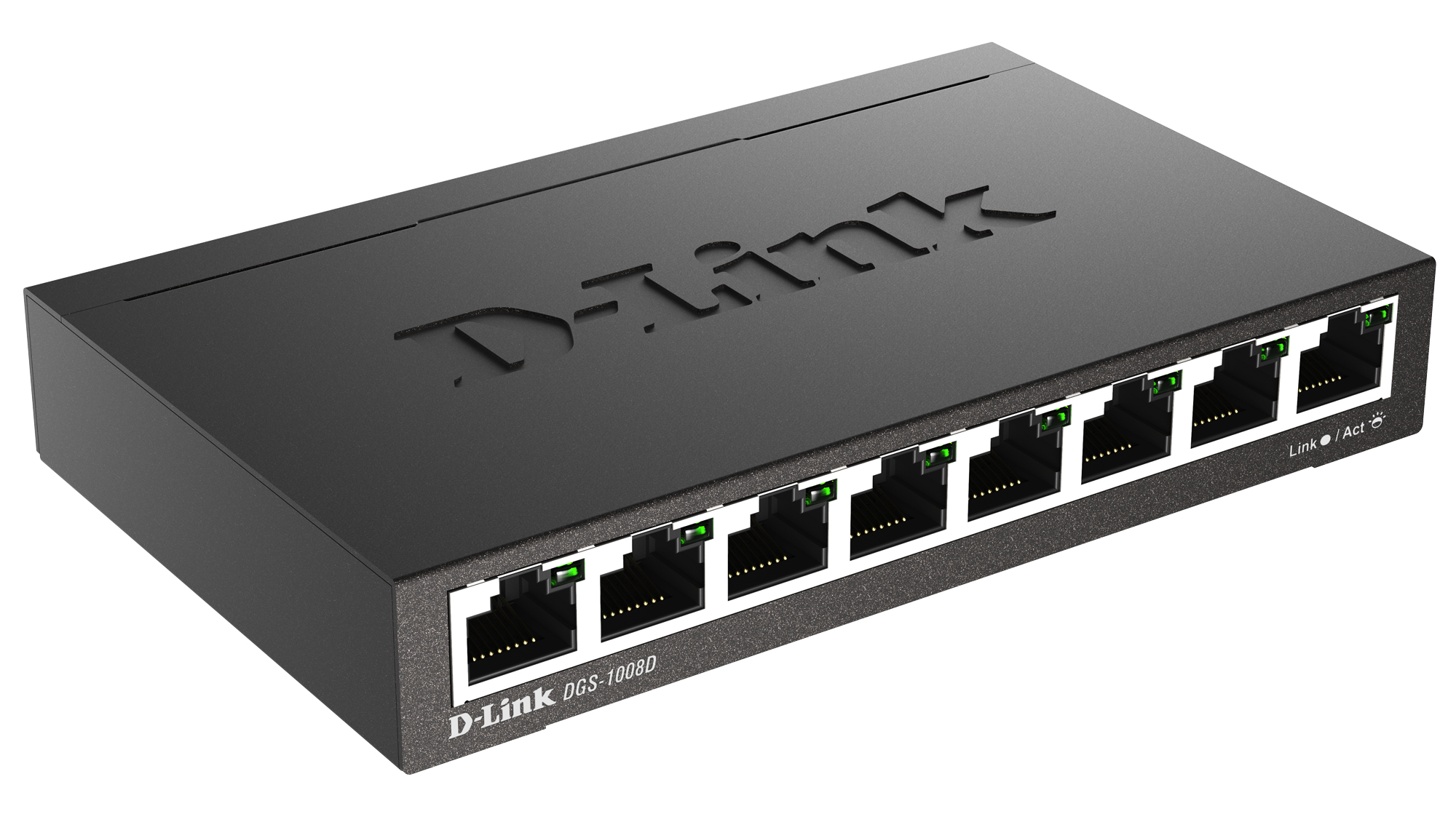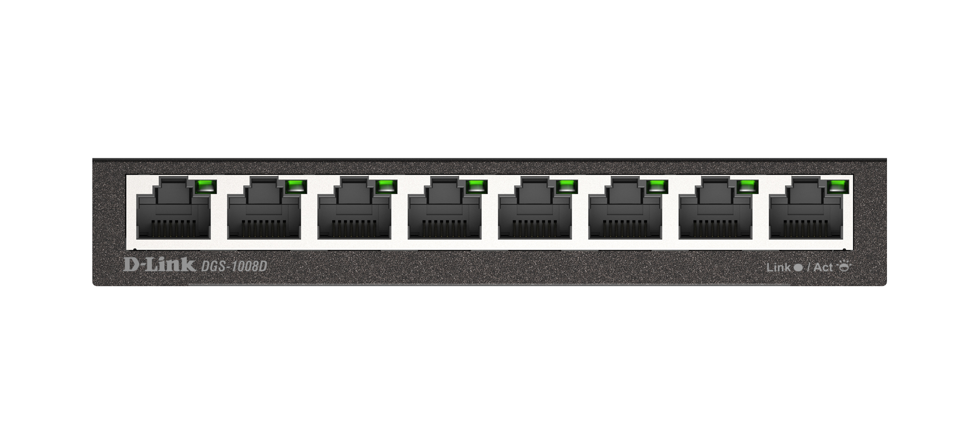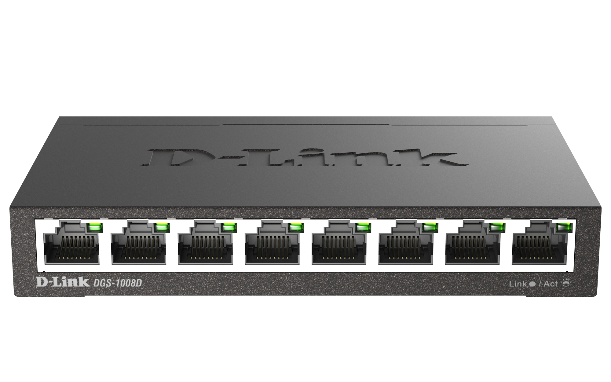 The DGS-1008D 8-Port 10/100/1000Base-T switch is ideally suited for Small Office Home Office (SOHO), Small Medium Business (SMB), and Small Medium Enterprise (SME) environments. With a durable design, silent operation, and plug-and-play functionality, the DGS-1008D switch can be easily set up and be placed in almost any location where network connectivity is required. Support for IEEE 802.3az Energy-Efficient Ethernet (EEE), 802.1p Quality of Service (QoS), and Gigabit Ethernet connection speeds provide advanced features in a compact package.