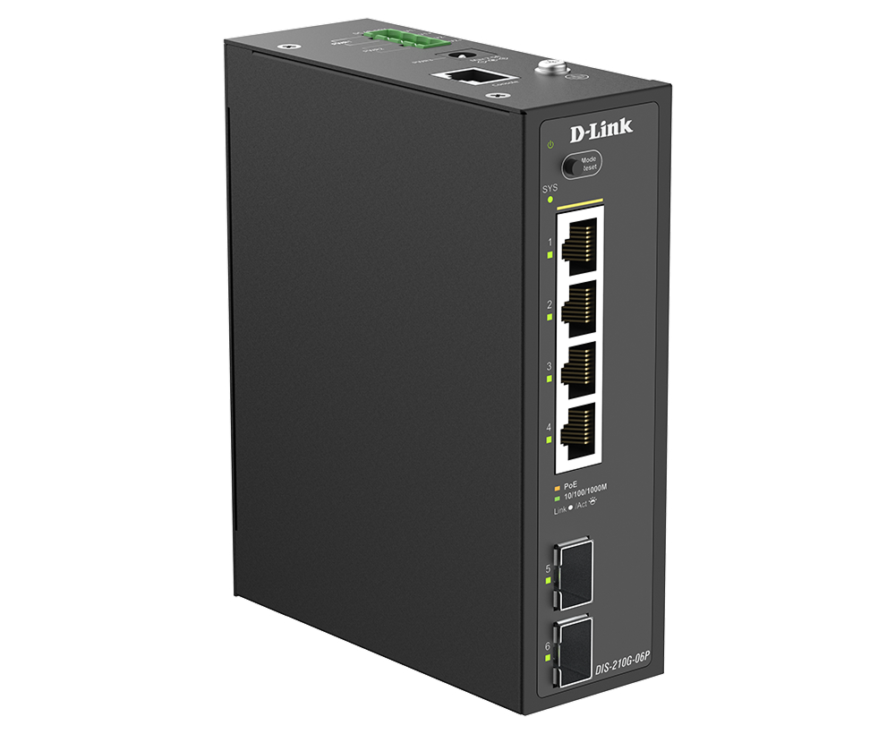 The DIS-210G-06P Layer 2 Gigabit Industrial Managed Switch is equipped with 4 PoE-capable 10/100/1000Base-T ports and 2 SFP ports. This switch features a robust design making it ideal for deployment in industrial and outdoor cabinet surveillance settings, capable of withstanding the harshest environments. The DIS-210G-06P switch furthermore integrates advanced management and security functions to provide a complete industrial networking solution.