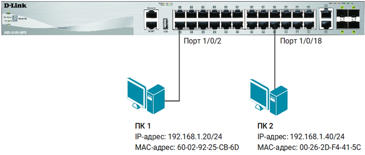 - Создайте записи IP Source Guard для компьютеров ПК1 и ПК2:
